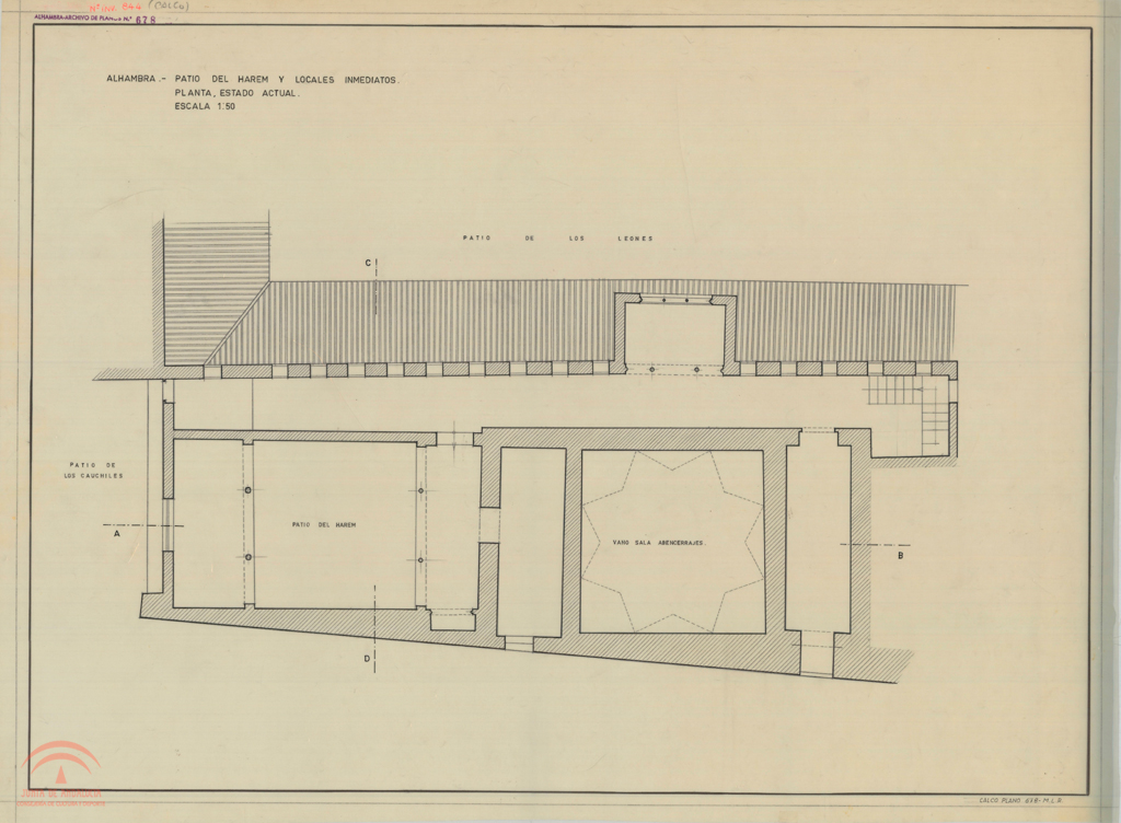 Descripción: Original, papel vegetal, tinta y lápiz, 57x77 cm., 1/50 sectores: 2.10.0.0., 2.9.0.0.Número de plano de la oficina técnica del servicio de conservación: 678, (Alhambra-archivo de planos Nº 678) Digitalizado Nota:"Calco del antiguo nº 678", actual 843. En el original: "Patio del Harem""
