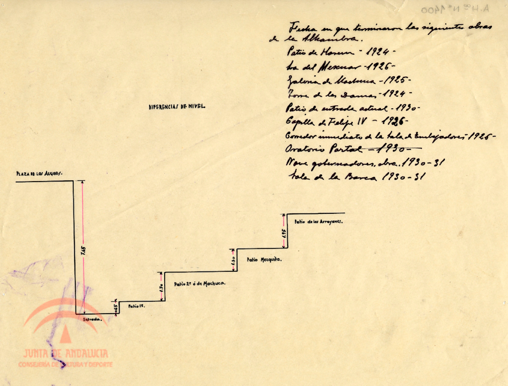 | Título: | Alhambra. Esquema de diferencias de nivel entre distintas zonas: Plaza de los Aljibes Patios de Machuca y Mexuar Patio de Arrayanes |
