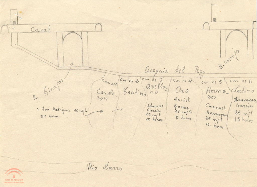 | Título: | Dehesa del Generalife. Acequia del Rey. Croquis de la Acequia del Rey en el tramo entre el Barranco de las Tinajas y del Conejo con las tomas de agua de los distintos cármenes |