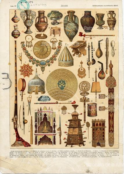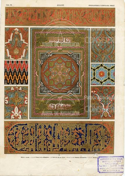 | Título: | Ilustración. Anverso: frisos Alhambra; plafones decorativos; mosaicos; cubierta Corán. Reverso: Arte árabe. Artes industriales (cerámica; vidrio; armas;" instrumentos musicales) |