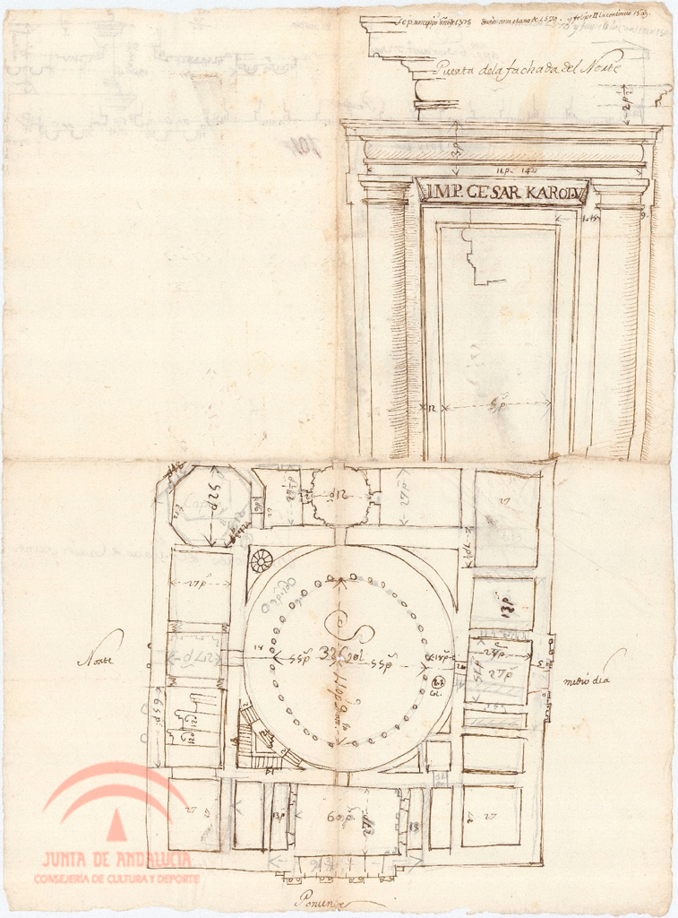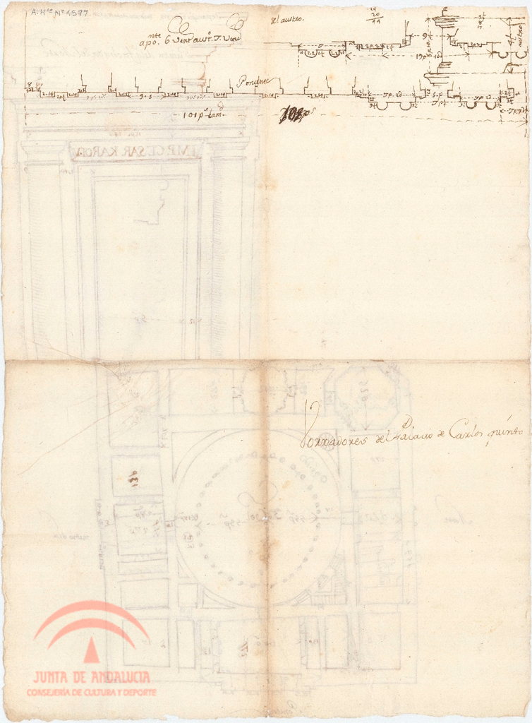| Título: | Palacio de Carlos V. Varios croquis en anverso y reverso: detalle de la puerta de la fachada Norte planta perfiles de columnas y muros |