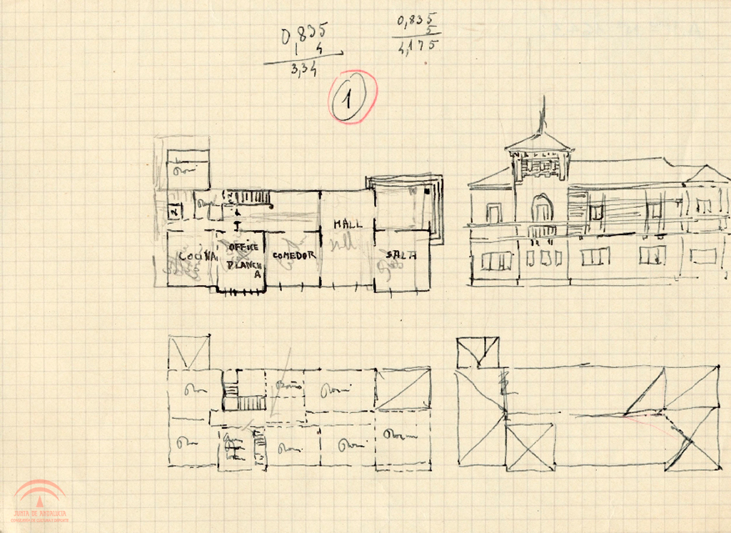 | Título: | Croquis de casa sin identificar. Alzado y 3 plantas |
