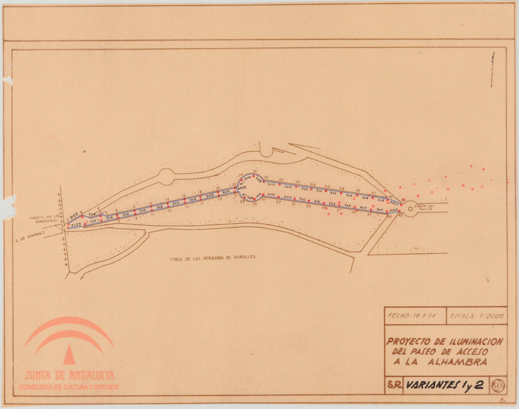 | dc.title | Proyecto de iluminación del Paseo central de acceso a la Alhambra entre el Arco de las Granadas y la Fuente del Tomate. Plano con puntos de luz. Variante 1 y 2 | es_ES |