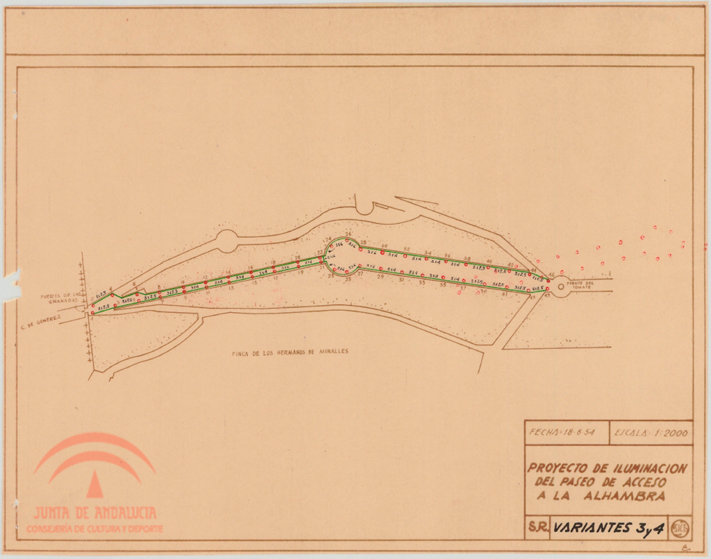 | dc.title | Proyecto de iluminación del Paseo central de acceso a la Alhambra entre el Arco de las Granadas y la Fuente del Tomate. Plano con puntos de luz. Variante 3 y 4 | es_ES |