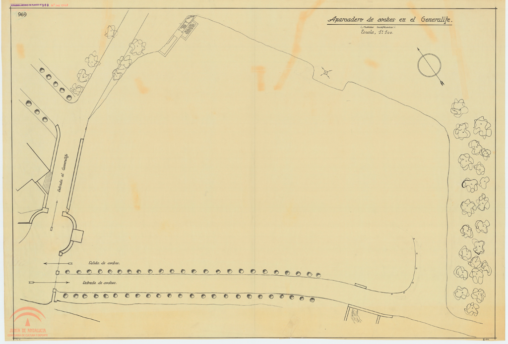 | Resumen: | Generalife. Aparcadero de coches, con medidas rectificadas y pilar árabe. Planta |