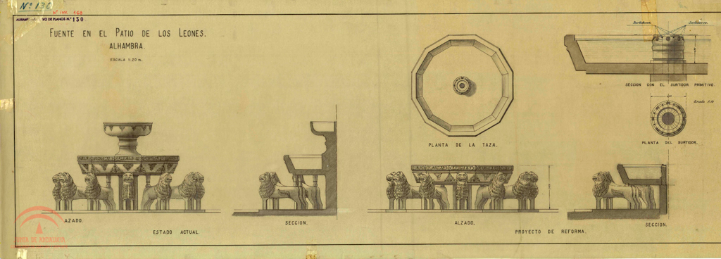 | Resumen: | Patio de los Leones. Fuente en su estado en el siglo XIX, y proyecto de reforma. Alzados, plantas y sección |