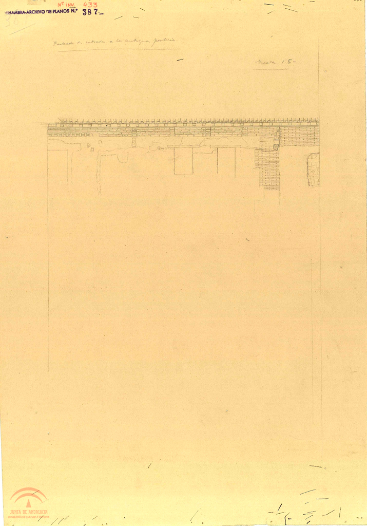 Descripción: Original, cartulina, lápiz, 48x34 cm., 1/50 sector: 2.16.0.0.Numero de plano de la oficina técnica del servicio de conservación: 387, (Alhambra-archivo de planos Nº 387) Digitalizado Inacabado.