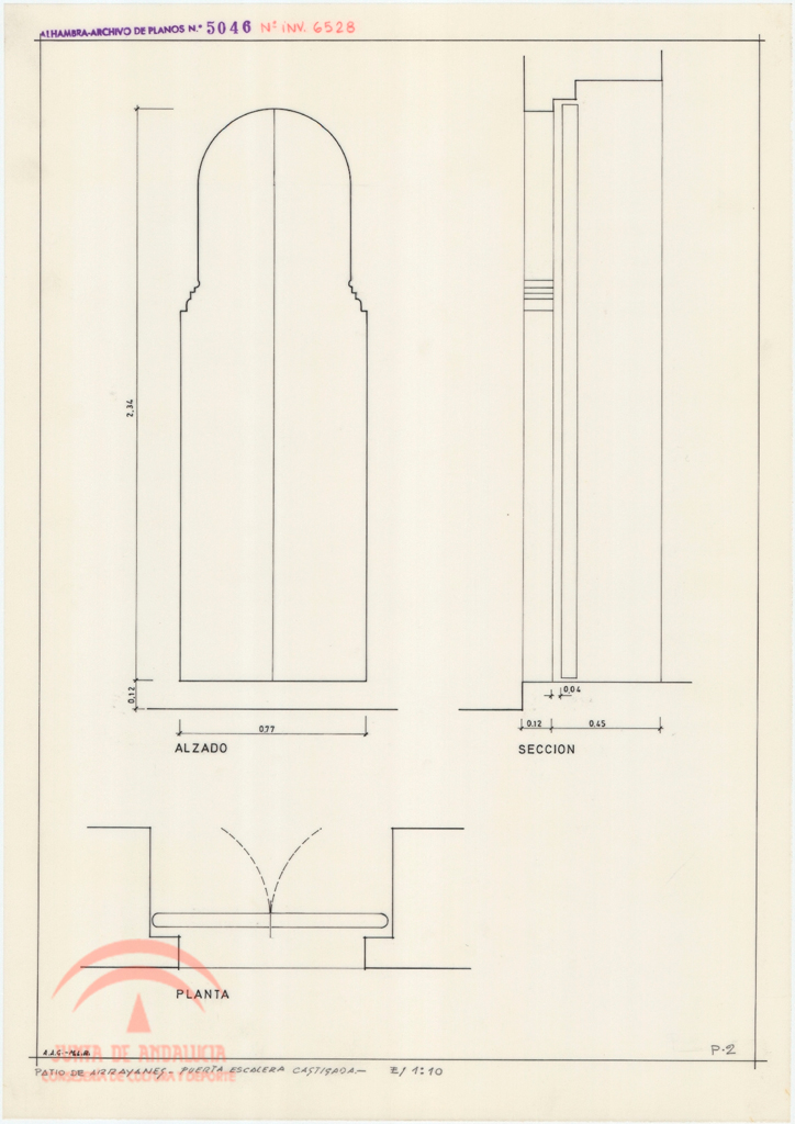 | Título: | Patio de Arrayanes. Puerta escalera "castigada". Puerta 2. Planta, alzado y sección |