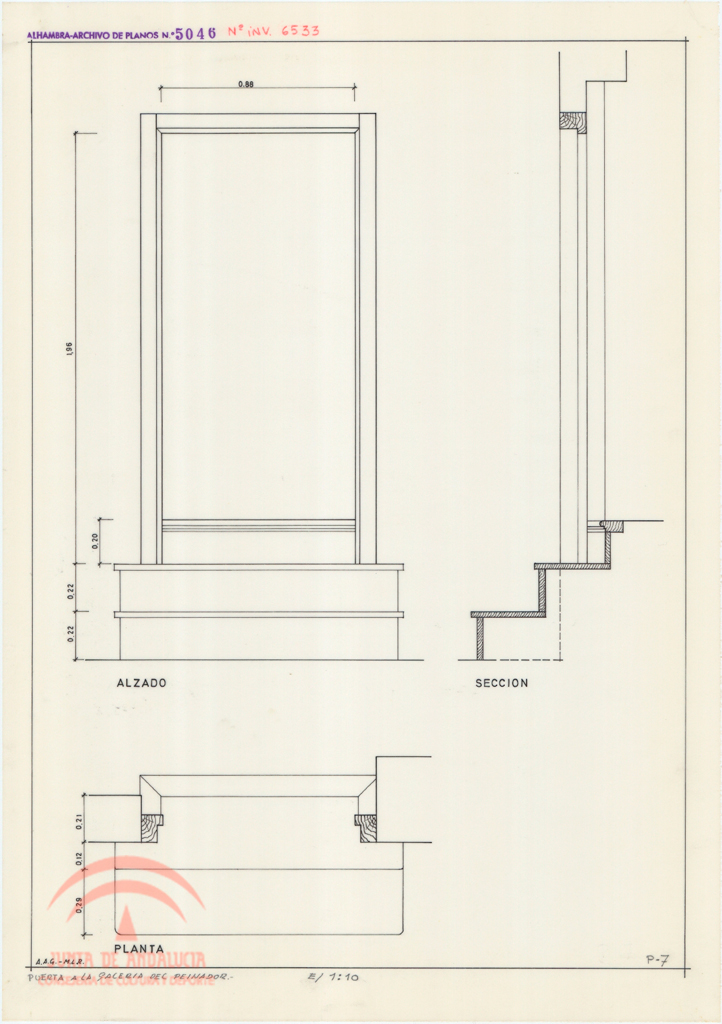 | Título: | Puerta a la Galería del Peinador. Puerta 7. Planta, alzado y sección |