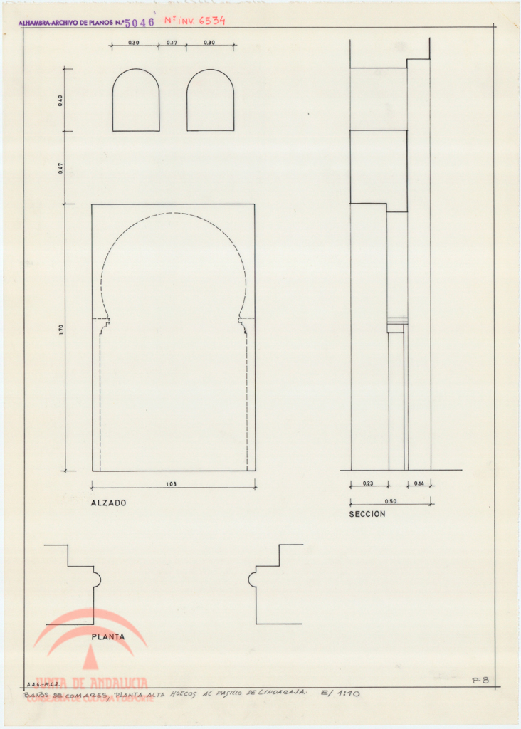 | dc.title | Baños de Comares. Planta alta, huecos al pasillo de Lindaraja. Puerta 8. Planta, alzado y sección | es_ES |