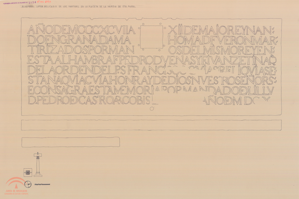 | Título: | Placeta de la iglesia de Santa María de la Alhambra. Lápida relicario de los Mártires (Inscripción en castellano). Alzado y perfiles. Alzado y plano del conjunto |