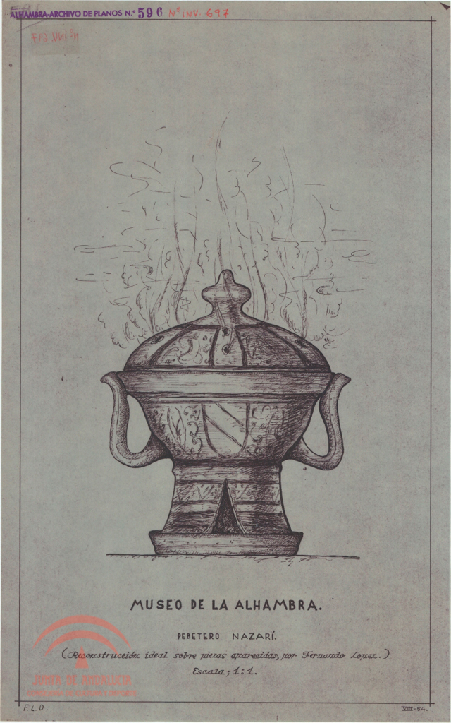 | Título: | "Museo de la Alhambra. Pebetero nazarí. Reconstrucción ideal sobre piezas aparecidas, por Fernando López" |