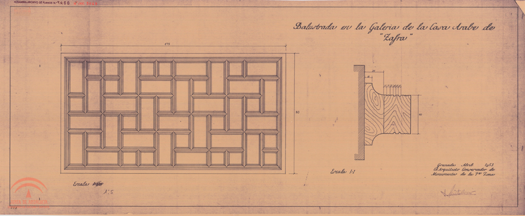 | dc.title | Granada. Casa Árabe de Zafra. Detalle de la balaustrada de la galería. Alzado y sección | es_ES |