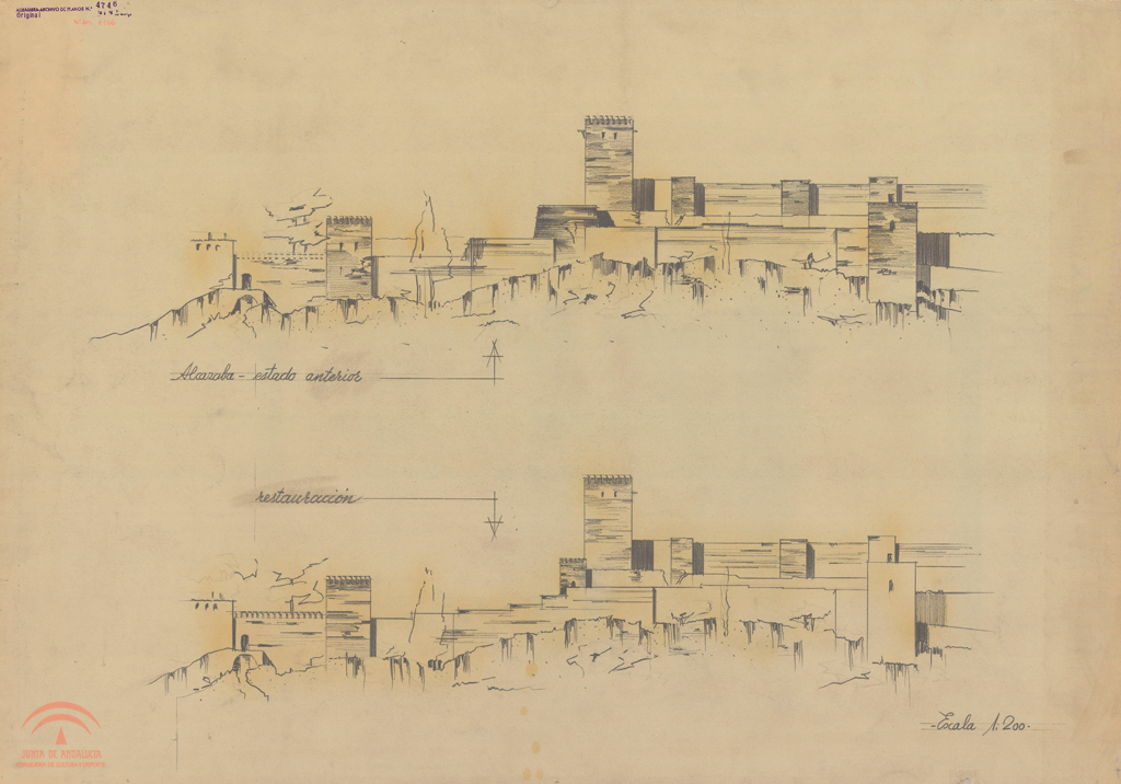 | Título: | Alcazaba. Alzado desde Torre de las Gallinas a Torre de las Armas. Estado anterior y restauración de murallas |