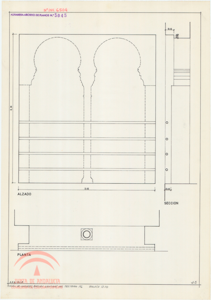 | Título: | Salón de Comares. Balcón central del testero Norte. Ventana 5. Planta, alzado y sección |
