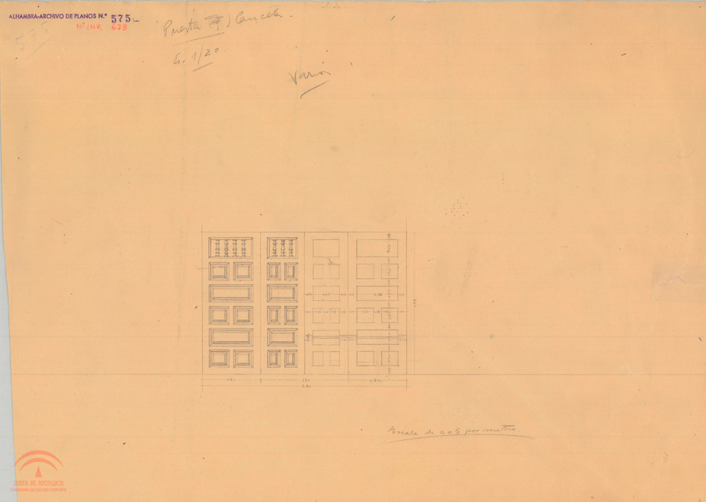 | Descripción: | Original, papel, lápiz, 35x48 cm., 1/20 Numero de plano de la oficina técnica del servicio de conservación: 575, (Alhambra-archivo de planos Nº 575) Digitalizado |