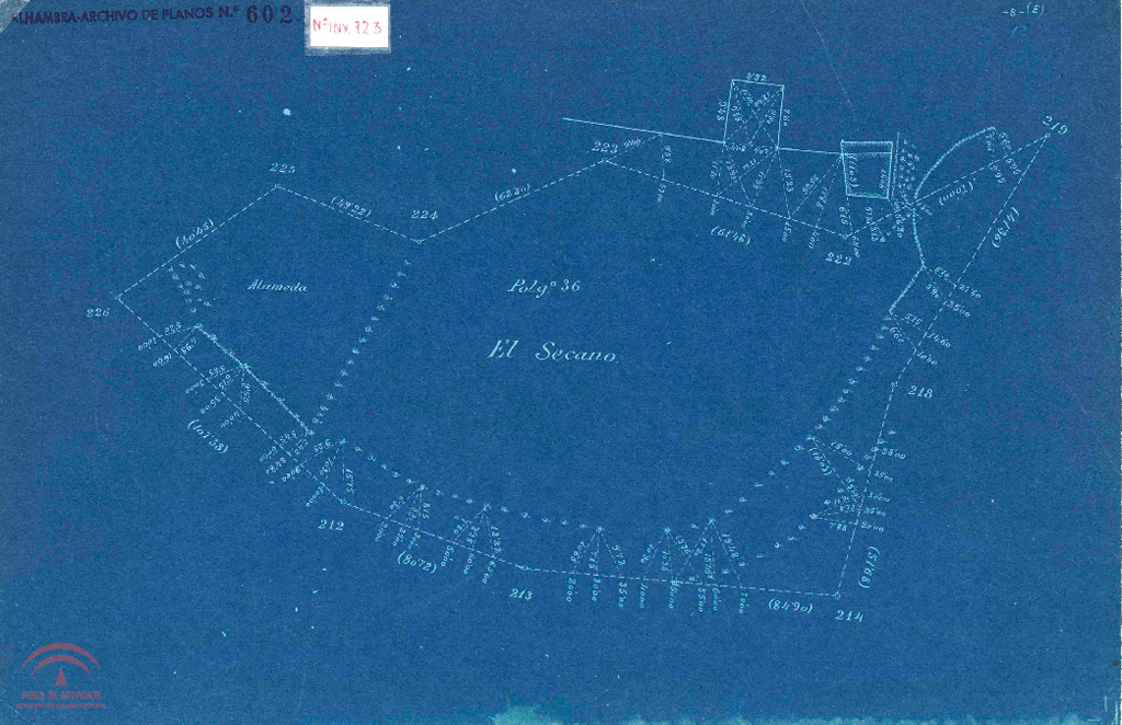 Descripción: Copia, papel, cianotipo, 22x33 cm., s.e. sectores: 7, 10Poligonación Zona Este del Plano General de GranadaNumero de plano de la oficina técnica del servicio de conservación: 602, (Alhambra-archivo de planos Nº 602) Digitalizado