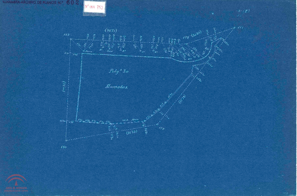 sector: 24 Poligonación Zona Este del Plano General de Granada Numero de plano de la oficina técnica del servicio de conservación: 602, (Alhambra-archivo de planos Nº 602) Digitalizado |