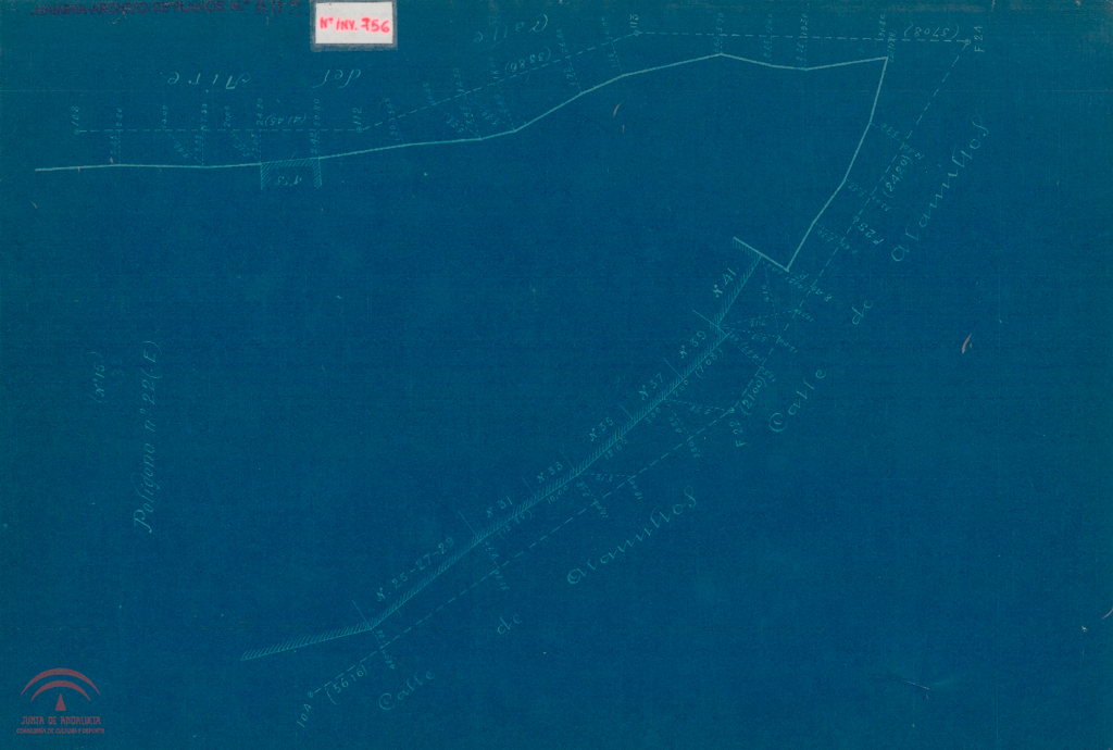 Descripción: Copia, papel, cianotipo, 22x33 cm., s.e. sector: 99Poligonación Zona Este del Plano General de GranadaNumero de plano de la oficina técnica del servicio de conservación: 602, (Alhambra-archivo de planos Nº 602) Digitalizado