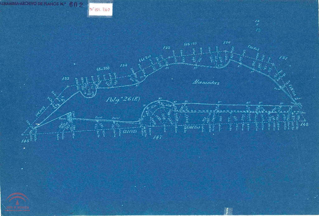 Descripción: Copia, papel, cianotipo, 22x32 cm., s.e. sector: 26Poligonación Zona Este del Plano General de GranadaNumero de plano de la oficina técnica del servicio de conservación: 602, (Alhambra-archivo de planos Nº 602) Digitalizado