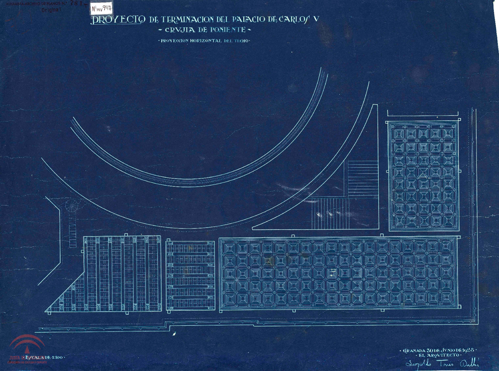 | Título: | "Proyecto de terminación del Palacio de Carlos V. Crujía de Poniente. Planta con proyección horizontal del techo" |