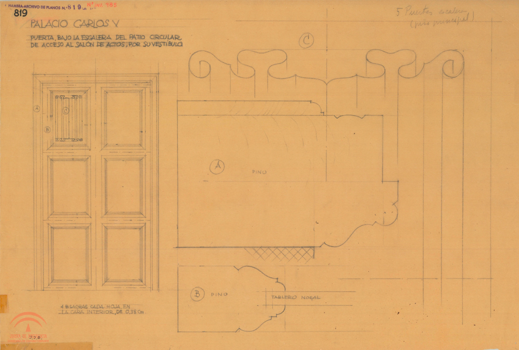 | Título: | "Palacio de Carlos V. Puerta bajo la escalera del patio circular de acceso al salón de actos, por su vestíbulo" |