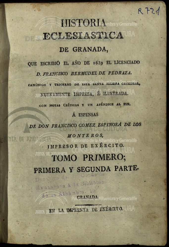 | dc.title | Historia Eclesiástica de Granada que escribió el año de 1639 el licenciado D. Francisco Bermúdez de Pedraza .... | es_ES |