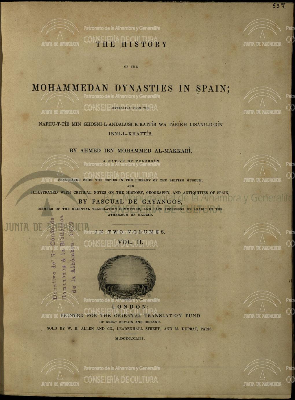 | Título: | The History of the Mohammedan Dinasties in Spain : extracted from the Nafhu-t-tib Min Ghosni-l-Andalusi-R-Rattib wa tarikh Lisanu-d-din ibni-l-Khattib |