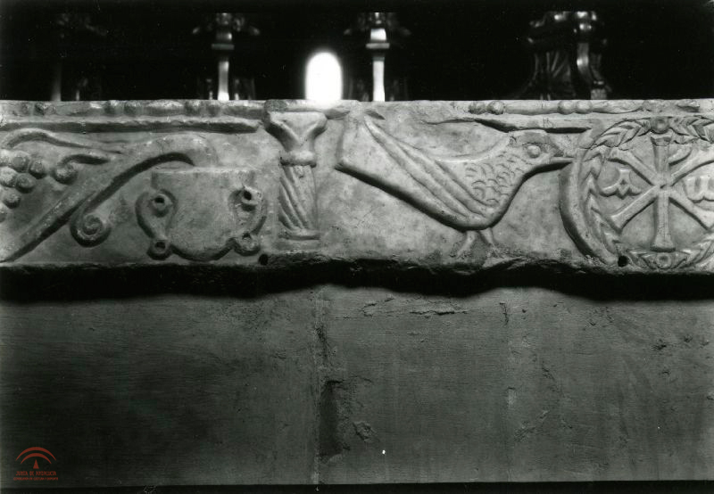 | Resumen: | Imagen de un friso con decoración paleocristiana reutilizado como altar cristiano, con los símbolos de alfa y omega, paloma de la paz, vides, etc. Sobre este friso reposan varios candelabros. |