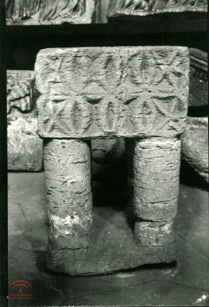 | Resumen: | Imagen de un fragmento toscamente labrado de época alto medieval o de época visigoda, dispuesto a modo de altar sobre unas columnas, detrás algunos fragmentos de relieves |