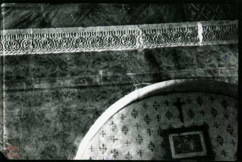 | Resumen: | Interior de una iglesia con un friso decorativo y pared pulida con decoración de pintura mural, probablemente de época románica. Al fondo, dentro del arco, un crucifijo y un cuadro de una estación de vía crucis |