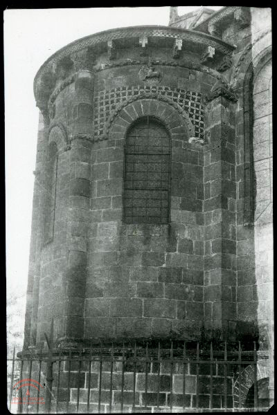 | Resumen: | Exterior de la abadía de Saint Austremoine d'Issore, de Issore, en la zona de Auvergne, del siglo X. Ábside y detalle de decoración con rosetón de minotauro, modillones y delante una reja de hierro |
