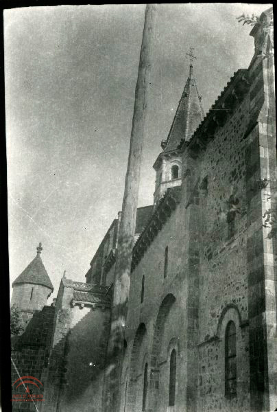 | Resumen: | Nave lateral y torre de la Colegiata de Saint Víctor et Sainte Couronne d'Ennezal, en la zona de Auvergne. Paramento con arcos de medio punto, friso y ventanas |