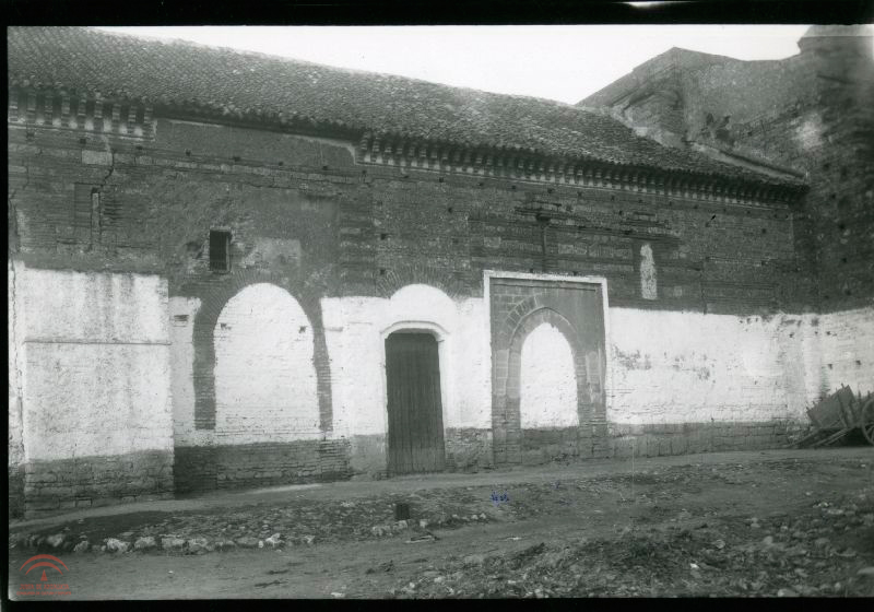| Resumen: | Exterior de una iglesia gótica-mudéjar con puerta cegada de arco de herradura. Parte del paramento está encalado. A la derecha un carro de madera. |