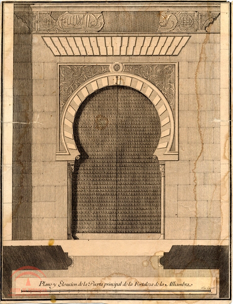 | Título: | Plano y elevación de la Puerta principal de la Fortaleza de la Alhambra. Vista de la Puerta de Siete Suelos. Dibujada por José de Hermosilla. Grabada por José Murguía |