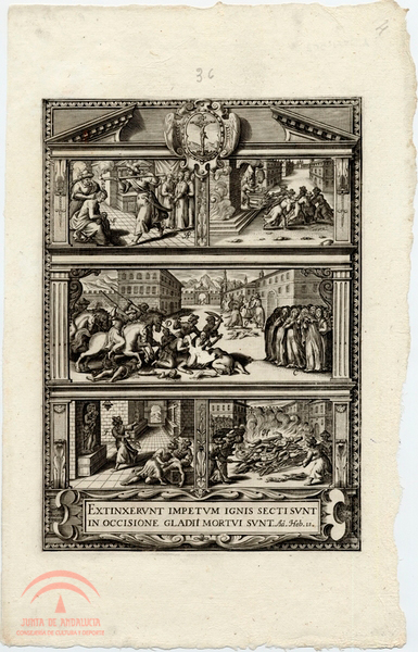 | Título: | Encenderunt igni..." (Mártires de Andarax: Profanación e incendio de la iglesia (A y B). Martirio del beneficiado Joan Lorenço (C y D) y de su hermano Martín (E). Martirio de Joan Cerrillo, Hierónimo de Sierra, Oropesa, Pedro y Francisco de Aguilar (G)) |