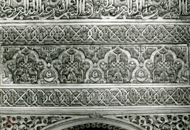Resumen: decoración en franjas del arco de la entrada al patio de la fachada de Comares. Sobre la albanega, una franja con motivos geométricos, la siguiente con decoración vegetal y escritura cúfica, una tercera franja, con el mismo motivo geométrico que la primera y sobre esta, una cenefa epigráfica