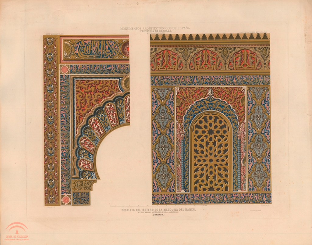 | Resumen: | Detalle del testero de la Mezquita del Harén en los Reales Alcazares de la Alhambra.N. Mendívil dib[ujó]., E. Buxó grab[ó]. Lámina del libro "Monumentos Arquitectónicos de España. Provincia de Granada. Palacio Árabe de la Alhambra", Madrid, Imprenta y Calcografía Nacional (1859-1881) |