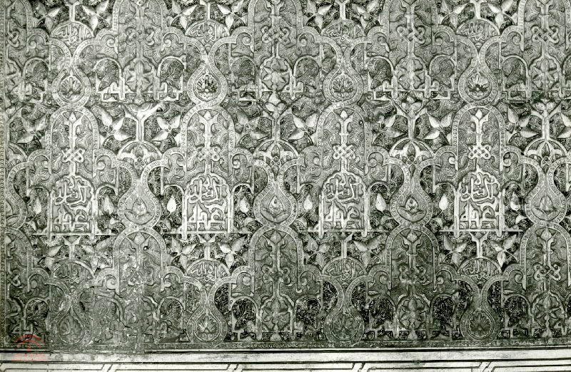 Resumen: Panel decorativo en yeso con motivos vegetales y diferentes tipos de escritura, con restos de policromía de la galería del patio de los leones presente también en la sala de los abencerrajes