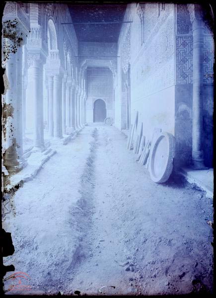 | Resumen: | Galería del Patio de los Leones de la Alhambra en obras, sin solería con un canal central abierto y varias tazas desmontadas |