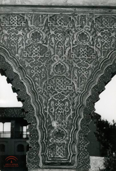 | Resumen: | Decoración de un paramento entre dos arcos de la ventana alta del pabellón sur del Generalife, con motivos vegetales, elementos cúficos, al fondo la galería del pabellón |