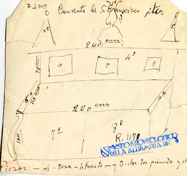 | Descripción: | Las esquinas superiores han desaparecido y la inferior derecha está doblada. El papel fotográfico esta muy debilitado y está rasgado en el lateral derecho. En el verso hay anotaciones en tinta negra del esquema y fuente con sus medidas 1 positivo en b/n 115 x 115 mm Signatura antigua R.1171 |