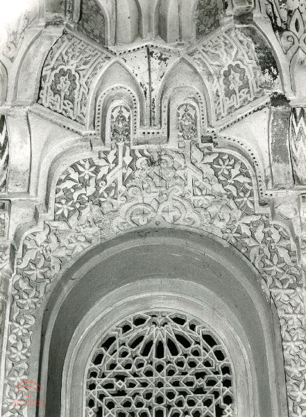 | Resumen: | Detalle de la decoración realizada en yeso de los espacios cuadrados externos de la Sala de los Reyes, con motivos vegetales, de escritura cufica y mocárabes encima del arco de celosía, se aprecia policromía en las yeserías |