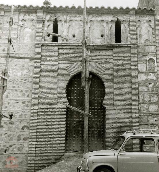 Resumen: Detalle de la fachada y de los arcos decorativos de la iglesia de San Andrés, de Toledo. La puerta tiene un arco de herradura de medio punto y los arcos superiores cegados en el centro y lobulados. A los extremos están abiertos . Conservan aún los restos del andamiaje de las obras de restauración. Delante de la puerta, un coche aparcado, marca SEAT 600