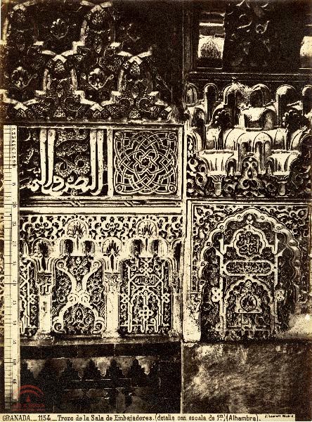 "Granada. 1154. Trozo de la Sala de Embajadores. (detalle con escala de 1m.) (Alhambra). J. Laurent. Madrid." |