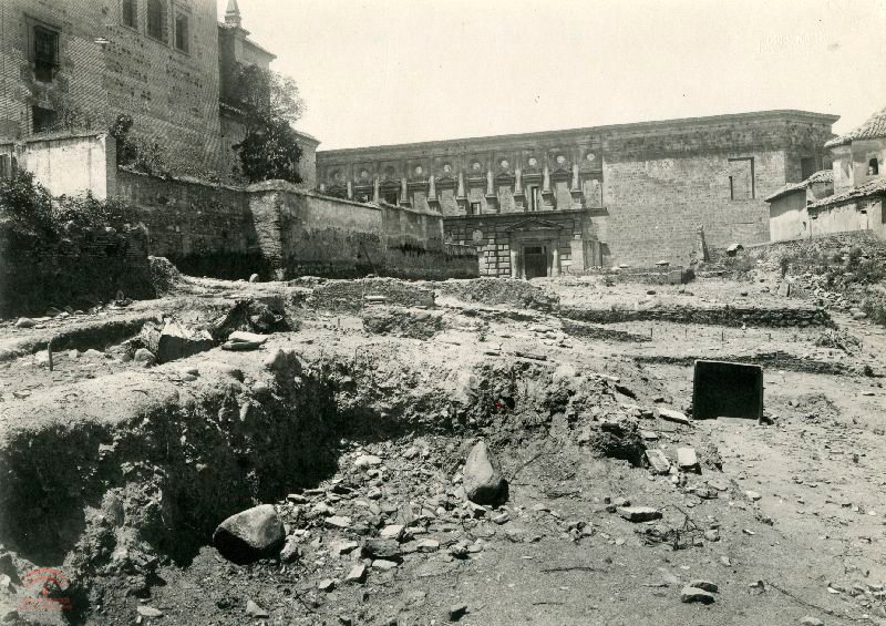 | Resumen: | En primer término la rauda comenzada la excavación aún, con tocones, al fondo el palacio de Carlos V con la puerta de la capilla y cripta, (el palacio aún sin cubrir) a la izquierda de la imagen la Iglesia de Santa María de la Alhambra. A la derecha la cubiertas de la Sala de los Reyes |
