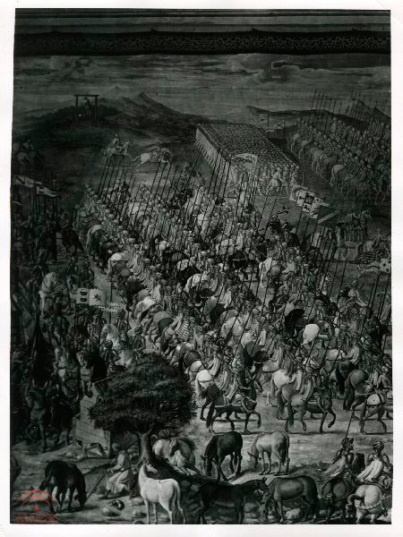 | Resumen: | Detalle del fresco de la Sala de las Batallas del Monasterio de San Lorenzo de El Escorial, del siglo XVI antes de la restauración. Obra de Granello, Tavaron, Castello y Cambiasso, pintada en 1585, sobre la vistoria militar de Juan II de Castilla sobre los ejercicios nazaríes de Granada, el 1 de julio de 1431, en las proximidades de la ciudad de Granada, en Higuera de Calatrava, Jaén. Ejércitos formados a caballo y en primer termino caballos en descanso |