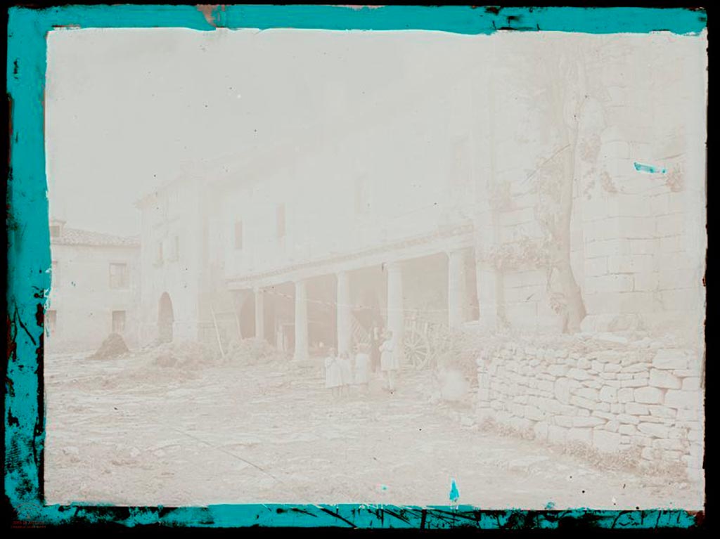| Resumen: | Palacio de la Fuente cerca de Santillana del Mar. Vista general. Santander. Casa señorial realizada en piedra de 2 alturas, los extremos están franqueados por estructuras que sobresalen de la fachada,el piso inferior en su parte central forma un pórtico con columnas pero adosadas al muro.Hay niños en el exterior. |