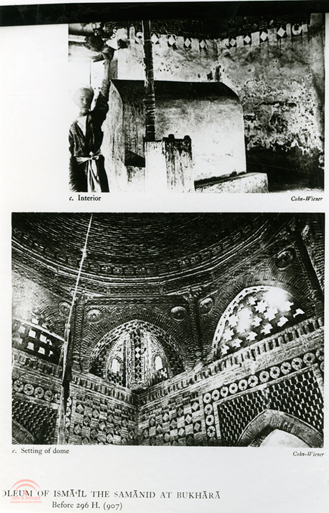 Resumen: Copia moderna de dos ilustraciones del Masueleo de Ismail Samani en Bukhara, en Uzbekistan, dedicado a Ismail Samani, fundador de la dinastía samaní, con simbolos zoroastricos. Plate 119 c) Interior; 119 e) setting of dome