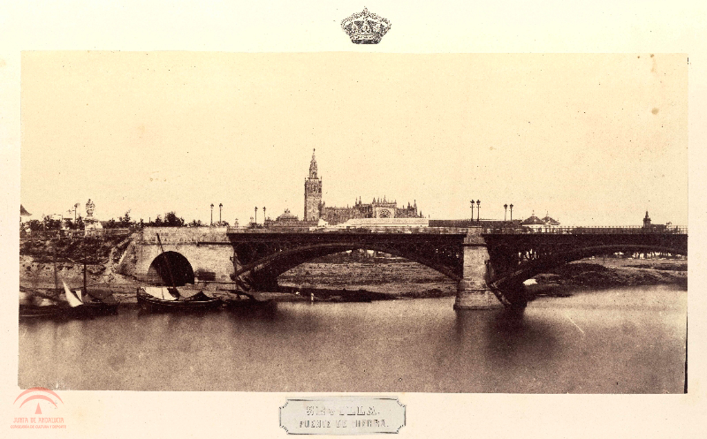 | Descripción: | pegada sobre soporte secundario, titulo en el soporte secundario, marca del fotografo en la parte inferior izquierda, sello de la biblioteca y estampación en frio del fotografo 600x440 mm, copia a la albumina virada a sepia 1.5.1. En el portada se lee "Recuerdos fotograficos de la visita de SS. MM. y AA. RR. a las provincias de Andalucia y Murcia en Septiembre y Octubre de 1862. Por C. Clifford, fotógrafo de S. M." Tambien hay un sello donde se lee "Donativo del Sr. Conde de Romanones a la Biblioteca de la Alhambra. 1909" 1.4.4. En la estampacion en frio se lee "[escudo fotografo]. C. Clifford. Photo of H. M.". En el sello se lee "Biblioteca de la Alhambra" 1.3.1. Denominado Puente de Triana, de Isabel II o de Hierro. Fue inaugurado en 1854. |